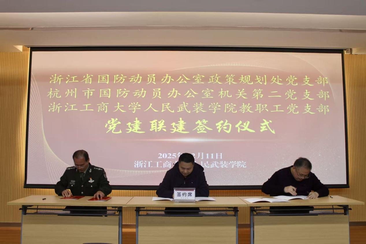 为深入贯彻新时代党的建设总要求,以高质量党建引领国防动员事业高质量发展,进一步搭建协同共建平台,切实将校地各方的政治优势、组织优势转化为国防动员建设的实践效能,凝聚起强国兴军的强大合力,12月11日,浙江省国防动员办公室政策规划处党支部、杭州市国防动员办公室机关第二党支部与浙江工商大学人民武装学院教职工党支部在浙江工商大学人民武装学院举行党建联建签约活动。浙江工商大学人民武装学院党委书记王忠华,党委副书记、纪委书记刘望秀,党委委员、副院长陈平,以及支部相关同志出席活动。王忠华代表学院衷心感谢省、市国动办长期以来对学院建设发展的关心与支持,并对现场各位同志的到来表示热烈欢迎。 他强调,学院将全面融入并主动对接浙江省、杭州市国防动员事业发展需求。国防动员办公室在政策统筹、资源整合、项目推进等方面具有重要职能和丰富实践经验,此次党建联建为学院提供了宝贵的合作机遇。学院将积极发挥自身平台与资源优势,全力支持并承接相关业务活动。最后他表示,学院将以饱满的热情和务实的作风,全力投入三方联建工作,与省、市国防动员办公室携手并进,共同推动国防动员事业高质量发展。